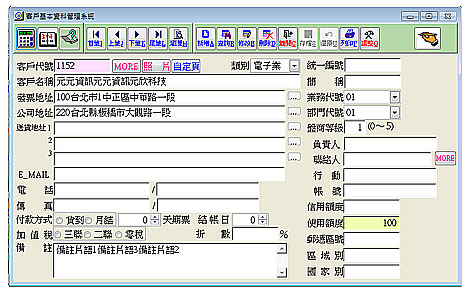 【客戶基本資料管理系統】 建立客戶相關基本資料以便提供單據帶入另提供複製現有客戶相關資料使用,加速建立單據,可記載客戶結帳日,付款方式及交易稅別。 提供聯絡相關資料欄位建檔以利快速找到客戶資料。 提供客戶資料明細列表,格式可列聯絡表、地址表,有效管理客戶。 提供自訂欄位設定,記錄時可彈性運用,客戶查詢。 提供客戶名稱、電話、傳真、統編等條件快速查詢您想要的客戶資料。