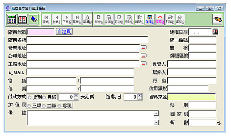 【廠商基本管理系統】 可建立廠商相關基本資料。以便提供單據帶入,另提供複製現有廠商相關資料使用。加速建立單據,可記載廠商結帳日,付款方式及交易稅別。 聯絡相關資料欄位建檔以利快速找到廠商資料 提供廠商資料明細列表,格式可列聯絡表、地址表,有效管理廠商資料。 自訂欄位設定,記錄時可彈性運用,廠商查詢。 提供廠商名稱、電話、傳真、統編等條件快速查詢您想要的廠商資料