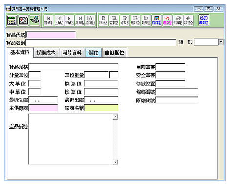 【貨品基本管理系統】 提供多行產品描述,並可記錄產品條碼編號及原廠貨號。 提供托工通知單、托工領料、托工入庫等單據,單據帶入相關貨品資料使用,加速建立單據速度,除了提供產品基本資料建檔外可將採購成本之計算方式記錄更可結合照片建檔,以利未來查查詢貨品時,可以有效了解產品資料。 提供複製功能,可將相同性質之產品相關資料複製建檔,加速貨品建立。 提供自訂欄位設定,記錄時可彈性運用,另可透過產品組立功能,建立 BOM 表以利領料入 庫時拆解組立,快速計算出用料明細,以加速領用入庫建檔及庫存管理,查詢時提供貨品名稱、規格、主供應商、原廠貨號等多條件查詢加速查詢貨品資料。