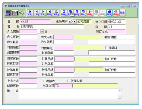 【圖書基本資料管理系統】 此功能可記錄每本書的印刷基本資料,像是內文開數、裝訂方式、內文頁數、內文跟封面的材質、彩色頁數、上光方式……等等,其中材質、上光方式、裝訂方式、開數……等等都有基本資料可以建立,不需要每新增一本書就要輸入一次。此基本資料建立後,可於發包、故障……等功能中選取帶入。 此外圖書基本資料也提供列印功能,可選擇書碼的範圍,將範圍內所有的圖書資料列印出來,在報表中可清楚地看到每本書的內文、封面、彩色、拆插及其他的印刷資訊,方便讓使用者可以一次觀看。