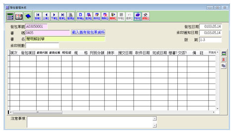 【發包管理系統】 當書本印刷的工作發包給廠商後,就需要建立發包單,此單據記錄著詳細的發包內容,例如書本名稱、印刷冊數、發包項目、廠商、印刷規格等資訊。發包單第一次建立時需自行輸入發包單的明細,往後同一本書再次發包時,可利用載入就有發包單資料的功能,將之前的發包資訊全部帶入,可再自行新增或修改發包項目,如此一來就無需再重複進行同樣的動作,節省單據建立的時間。 發包單提供兩種列印的功能,可分為發包單跟工作單,前者不分類別,將明細全數列印出來;而工作單會參照類別,將內文跟封面分開列印,兩種不同的報表皆可當作發包的依據。