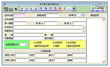 【客戶基本資料管理系統】 建立客戶相關基本資料及倉租相關基本設定。可設定客戶倉租收費 方式,可分為以日計、5日計、10日 計、進以5日出以旬、租坪及進以 日出以旬六種方式,也可設定入倉裝卸費可分有板或無板,以40呎、20呎或每才或每噸計算裝卸費。 公司地址或發票地址可使用地址精靈輕鬆代入全省地址。