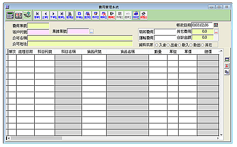 【費用單管理系統】 費用單資料可由入倉單或出倉單或散貨入倉或散貨出倉自動轉入,亦可採自行輸入,可建立臨時性費用單據。 可詳細記載處理日期及各 項費用明細。 此費用單資料會於倉 租帳款結算時一併計算至當期帳單中。 其他費用可輸入10項明細,可自訂項目名稱,各費用可詳載是由何貨品加工衍生,費用資料清楚完整。
