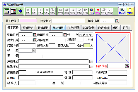 【員工資料建立】 員工資料建立系統可管理員工基本資料、薪資模式、工作經歷、家庭背景及公司安排的教育訓練,並有員工基本資料表、員工聯絡表、學歷專長表提供給管理者方便瀏覽,以方便了解公司員工的家庭背景,提供更好的職務內容。 此功能不單單只有自行輸入的功能,在與元欣人事薪資做結合後,能直接透過從人力銀行整理出來的人才基本資料中帶入,可節省許多建立的時間,也可以減少錯誤發生。 本套主旨在於管理員工的出勤資料,而在員工基本資料中更能直接看出員工的出勤、請假、遲到、早退等天數,讓使用者操作更直覺。