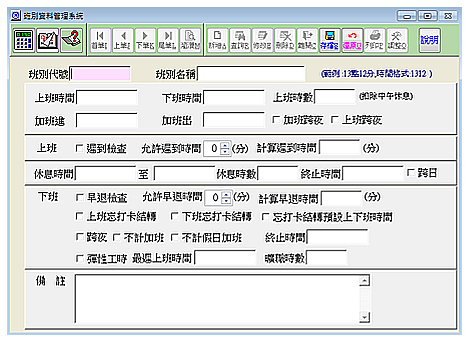 【班別資料管理系統】 班別基本資料在於設定各種班別的上加班時間、加班時間、休息時間等等資料,提供多種條件設定,以解決每間公司不同的班別規則。 設定方式非常簡單,只要將符合班別規則的條件勾選起來,有上班跨夜,就勾上班跨夜,加班有跨夜,就勾加班跨夜,這般別是彈性工時,就勾彈性工時,系統再計算出勤資料時,就會依照班別有勾選的條件去處理。 班別基本資料也提供了說明的功能,若使用者對設定有不了解的地方,可以看說明的內容,來完成班別設定的工作。