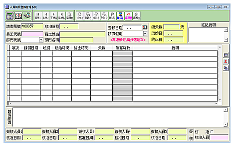 【人員請假登錄管理系統】 人員請假登錄管理系統在於紀錄詳細的員工請假資料,此單據建立的方式十分簡易,只需要選擇本次請假的員工代號,輸入請假日期,再選擇請假的班別,系統會自動帶入起始時間跟終止時間,並換算出請假的天數跟時數。 人員請假登錄管理系統也有審核的功能,搭配審核精靈,公司可以建立完善的請假制度,能夠控管員工的請假時間。 此功能也可搭配期間員工請假明細使用,期間請假明細可清出看出員工什麼時間請什麼假,也可知道員工那天請什麼班別,一目瞭然。