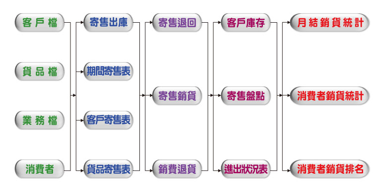 提供寄賣專屬流程,商品上櫃、退回及寄售銷貨寄售盤點,且自動產生應收帳款自動計算客戶庫存即時反應寄售追加訊息,可整合公司進銷存模組,寄售及月結及零售銷售完美整合。
