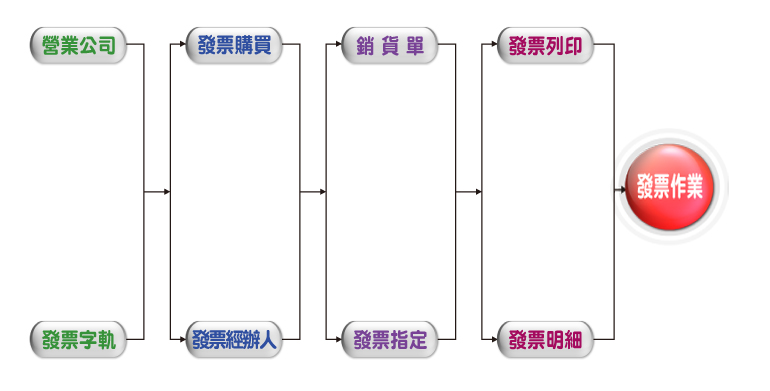 提供計算機發票、二聯式發票、三聯式發票開立,可隨貨開立發票或月結整批開立,完整解決銷貨發票開立作業。流程可分為營業公司建立 、發票字軌、發票購買、銷貨隨貨發票開立、月結發票開立等。