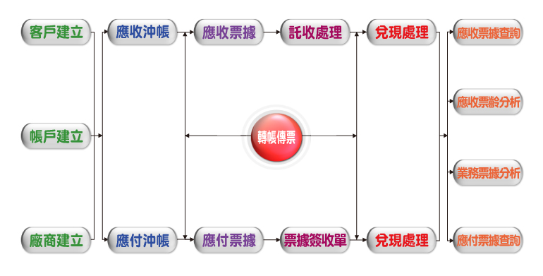 票據的處理程序包含收付票、託收、領取、兌現、 退票、作廢、銀行存提款、轉帳等功能完整。系統內建全省銀行資料,並可自行設定銀行帳戶,節省帳務人員登打時間 。